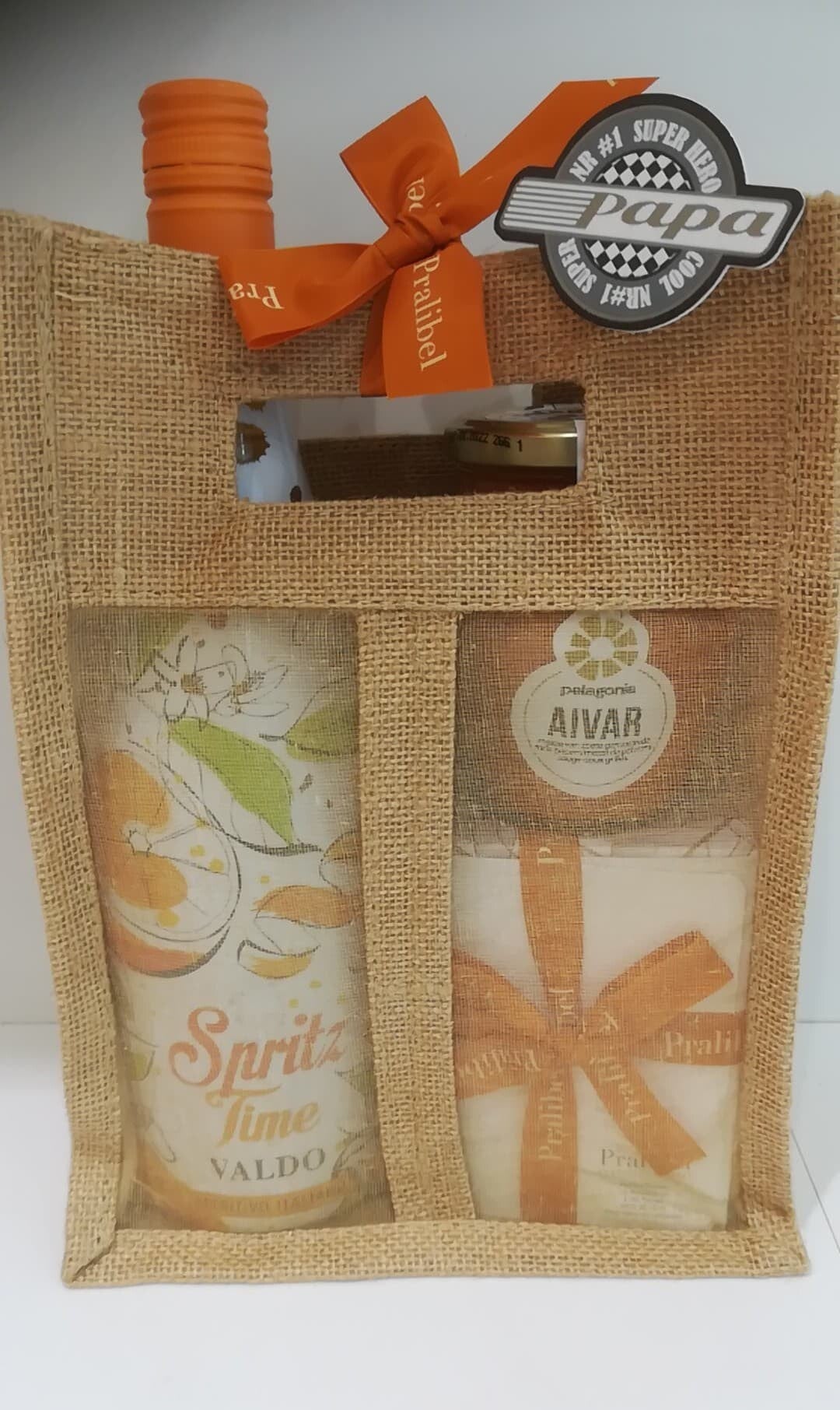 Mooi vaderdagpakket bestaande uit een fles Spritz (Apérol), een doosje pralines en mezze van zoete geroosterde pepers