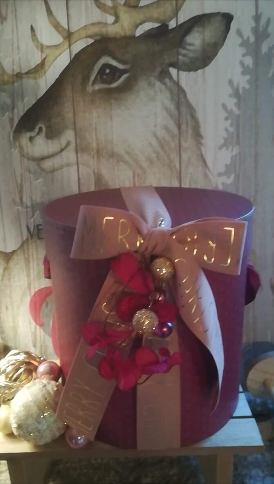Hoedendoos gevuld met 250 gr pralines, boterhampaste comptoir de mathilde, zakje snoep, klein flesje prosecco, stuk nougat, koekjes comptoir de mathilde en zakje losse thee.