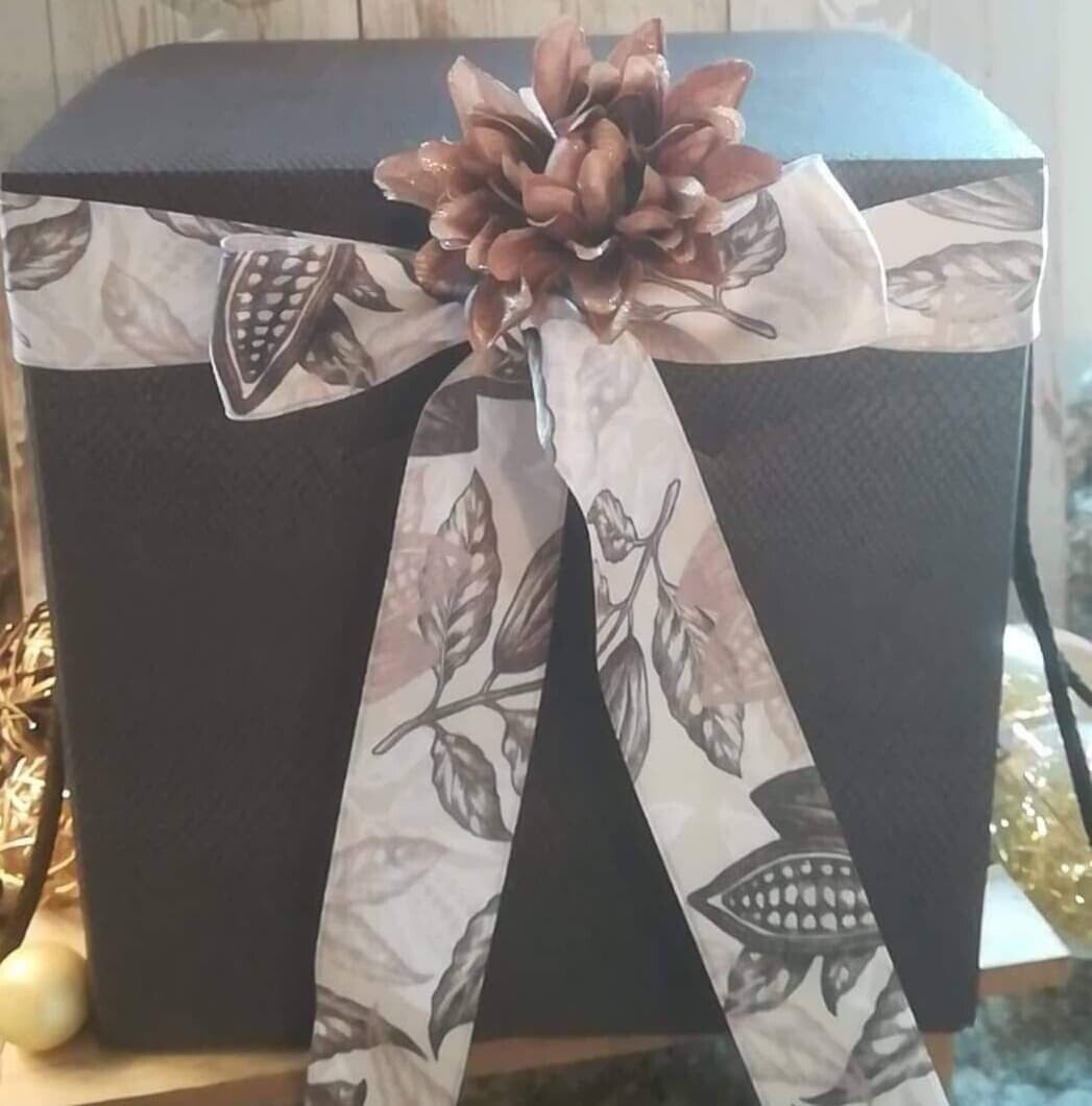 Opbergdoos gevuld met pralines sterrenchef Bart De Smidt **, boterhampasta comptoir de mathilde, pakje nootjes, tablet chocolade, zakje rochers, stuk nougat, terrine comptoir de mathilde en potje confituur.