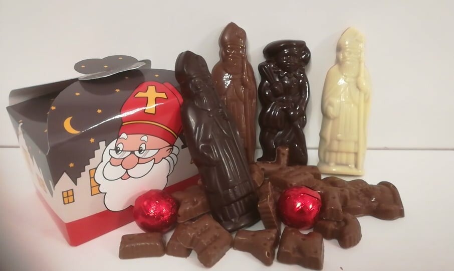 Doosje gevuld met 5 gevulde karakken ( vanille, banaan, gepofte rijst, kokos, framboos), chocolade nic nacjes, 2 parels gevuld met ganache.